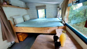Ici, vous êtes en pleine nature, entouré par des arbres de différentes essences. Un lit double à l’intérieur et un autre sur la terrasse couverte vous invitent à lézarder, voire à dormir à « La Belle » étoile.