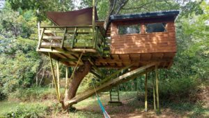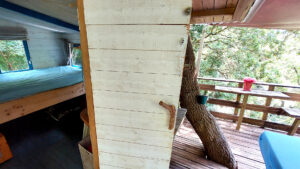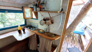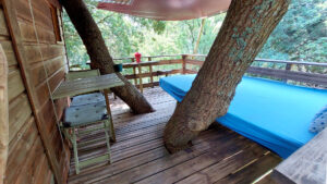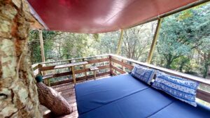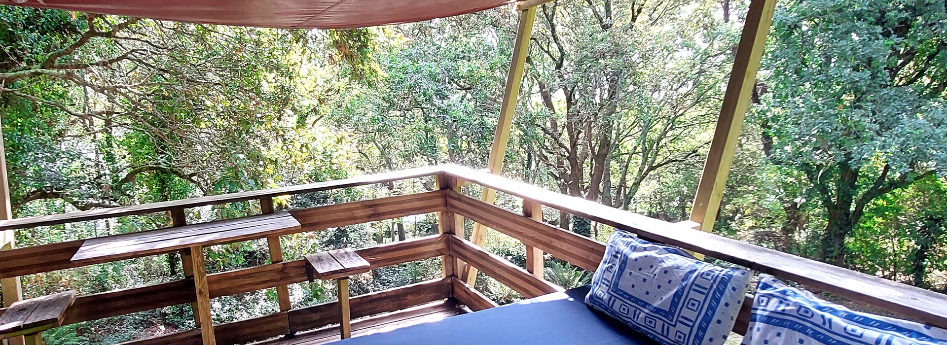 La mer bruisse, 80 m plus bas, depuis cette cabane suspendue entre les arbres. On y dort à l’intérieur ou à « La Belle » étoile, dans un lit double sur une terrasse couverte. Simplicité du moment. Connexion avec la nature.