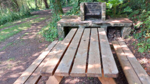 - Une terrasse avec une table au niveau du sol, près du barbecue