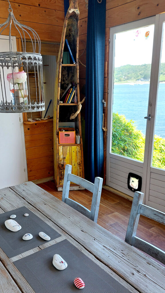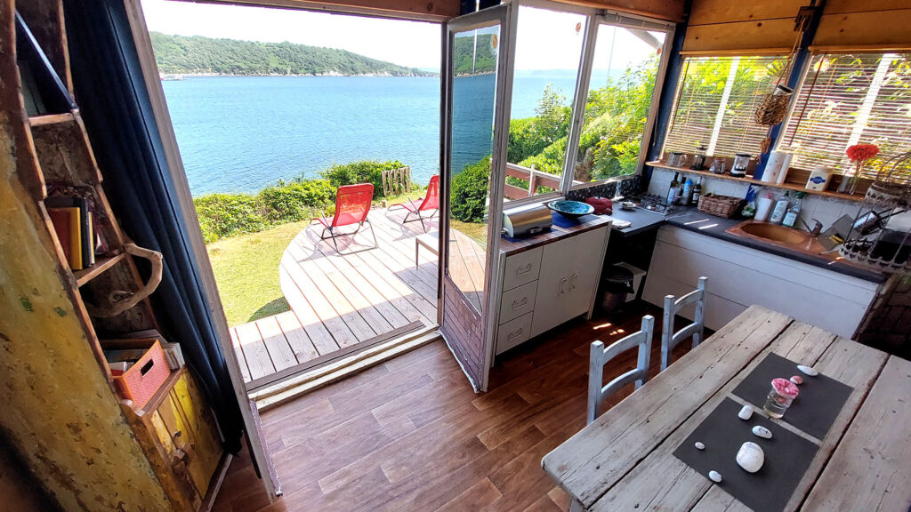 Une cabane tout au bord de l’eau, avec une vue époustouflante. Posée sur son rocher, plein sud, face à la mer, sans aucun autre vis-à-vis que le ballet des bateaux qui rentrent et sortent de la baie. Elle offre un environnement idéal pour rêver, se reposer et vivre en pleine nature, au rythme des marées. Il vous suffit de savourer l’instant.