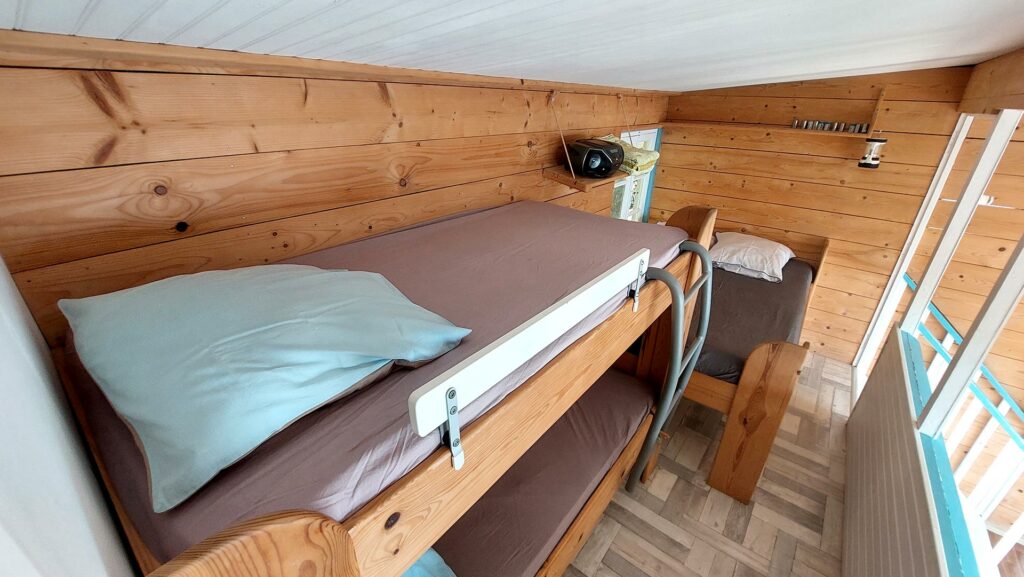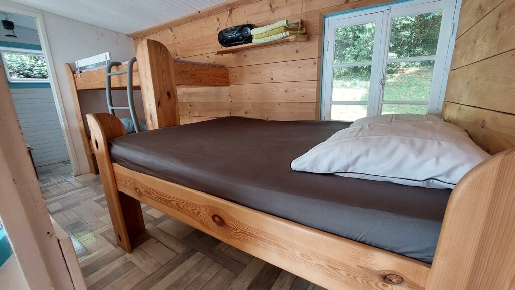 - Un lit double et deux lits superposés taille adulte